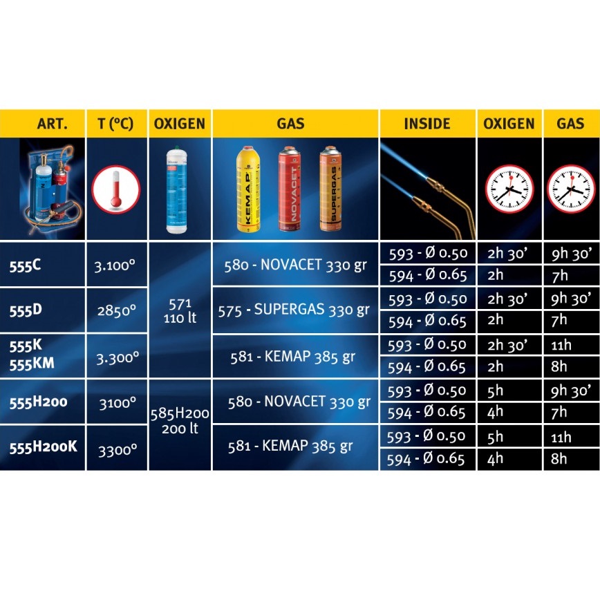 Komplekt sisaldab: hapniku rõhu reduktor, gaasi reguleerimisventiil, tagasilöögiklapid, 1.5m voolik, kahe punktiga põleti Ø0.5 ja Ø0.65, ühekordselt kasutatav hapniku balloon 930ml(110bar), ühekordselt kasutatav probaan. Leegi temperatuur 3100°, maksimaalne töötlemistemperatuur 1600°. Ideaalne pehme ja tugeva kõvajoodisega jootmiseks, raua lõikamiseks ja metallielementide keevitamiseks ja kõvajoodisega jootmiseks hüdraulikas ja kliimaseadmetes. Komplekti kuuluvad kaitseprillid.